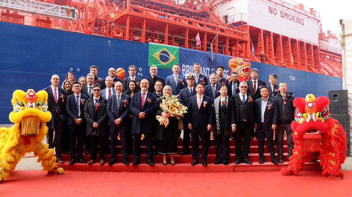 Braskem代表教母Silvia Pires Migueles女士表示:BRILLIANT FUTURE”輪不僅是船舶建造工程上的奇跡,更是揚子三井與Hartmann雙方敬業(yè)的團隊合作、對市場需求、技術(shù)創(chuàng)新的遠見卓識以及所有建造者努力奮斗的結(jié)晶;建造過程中每一個細節(jié)、每一個決策都承載著團隊的智慧和汗水。隨后,教母為新船命名,并擲香檳禮。鞭炮、禮花齊響,汽笛共鳴,龍獅共舞。祝福新船、隨船船員航行平安,為船東和租家?guī)砗眠\與財富,為Hartmann、DNV和揚子三井帶來榮耀。